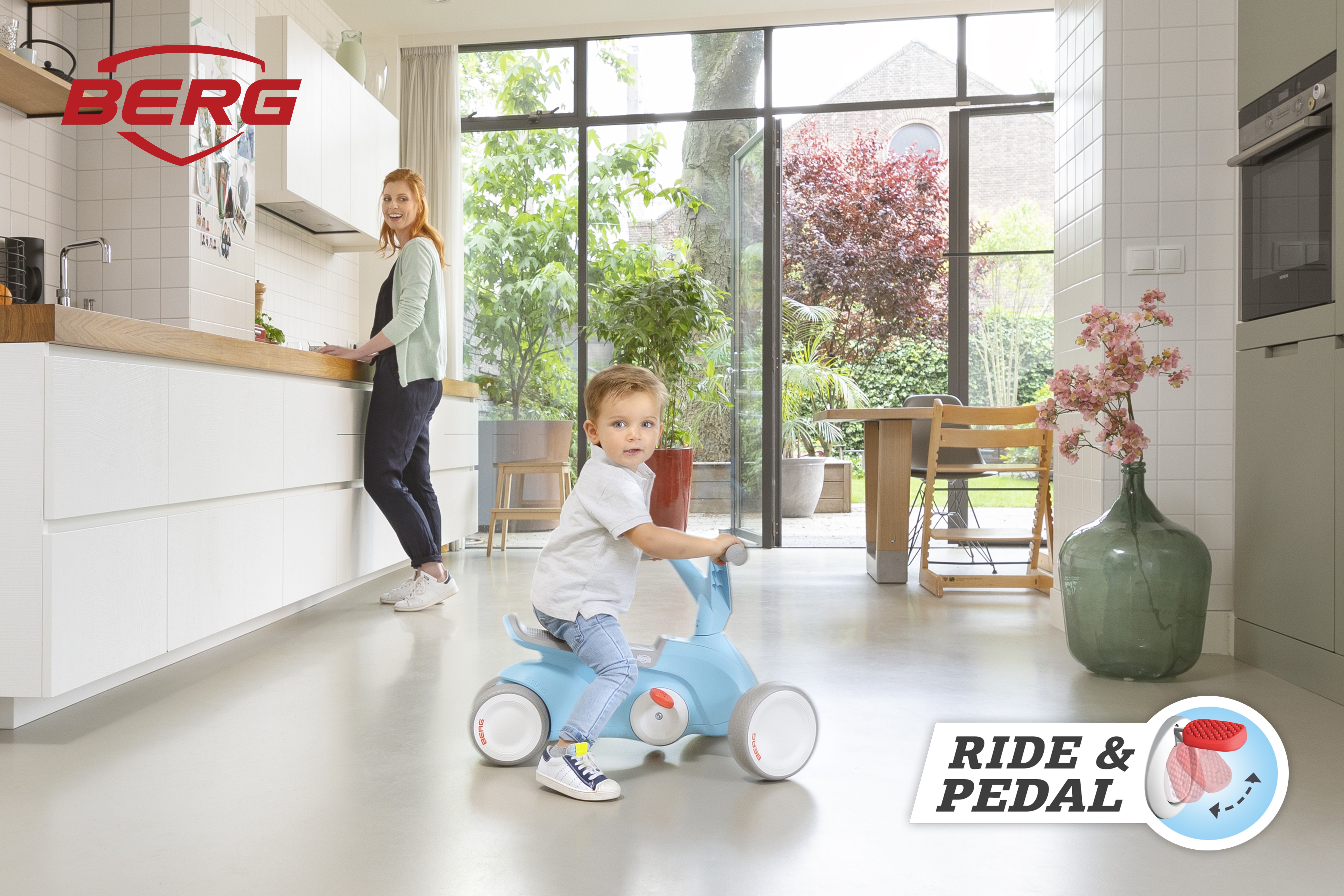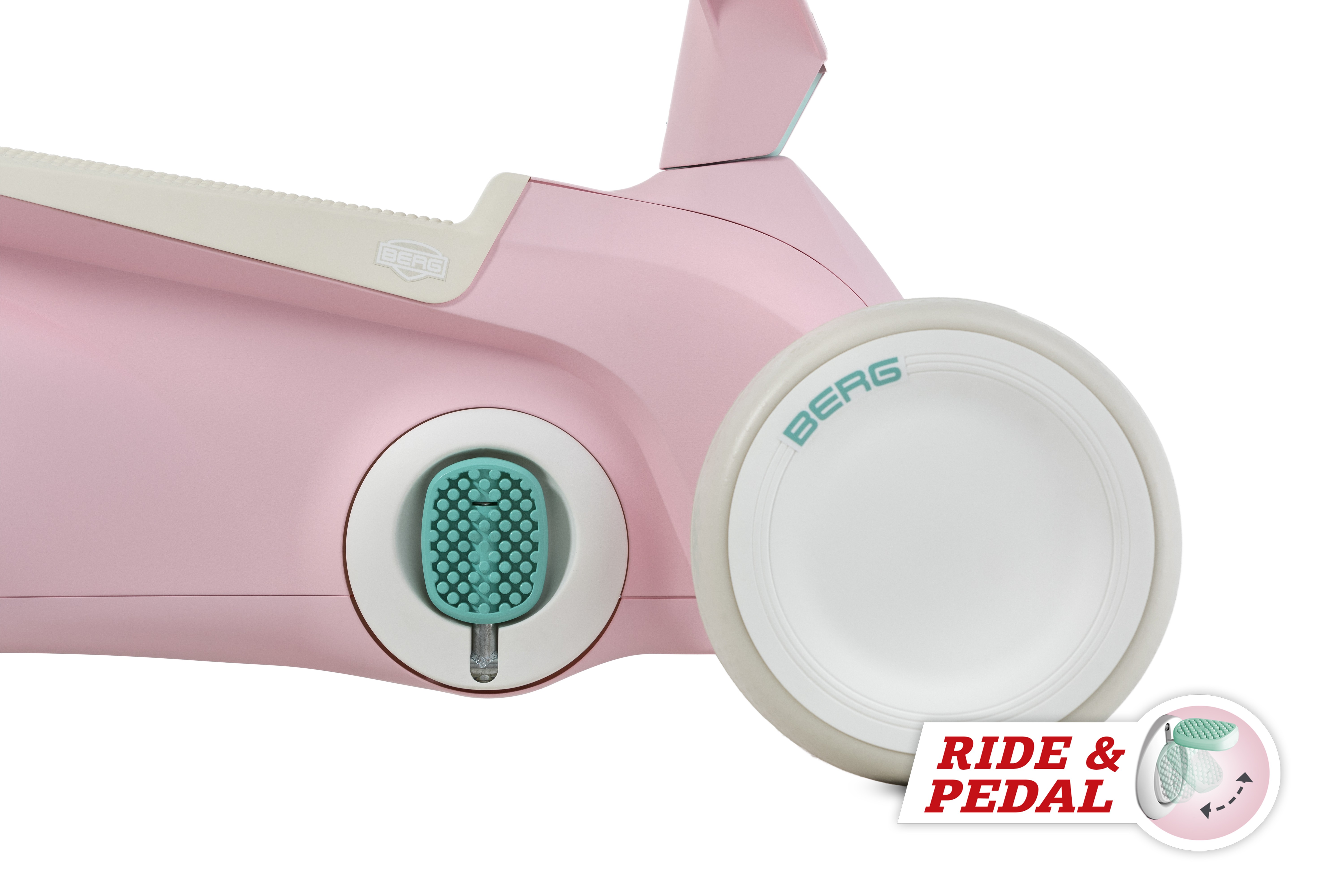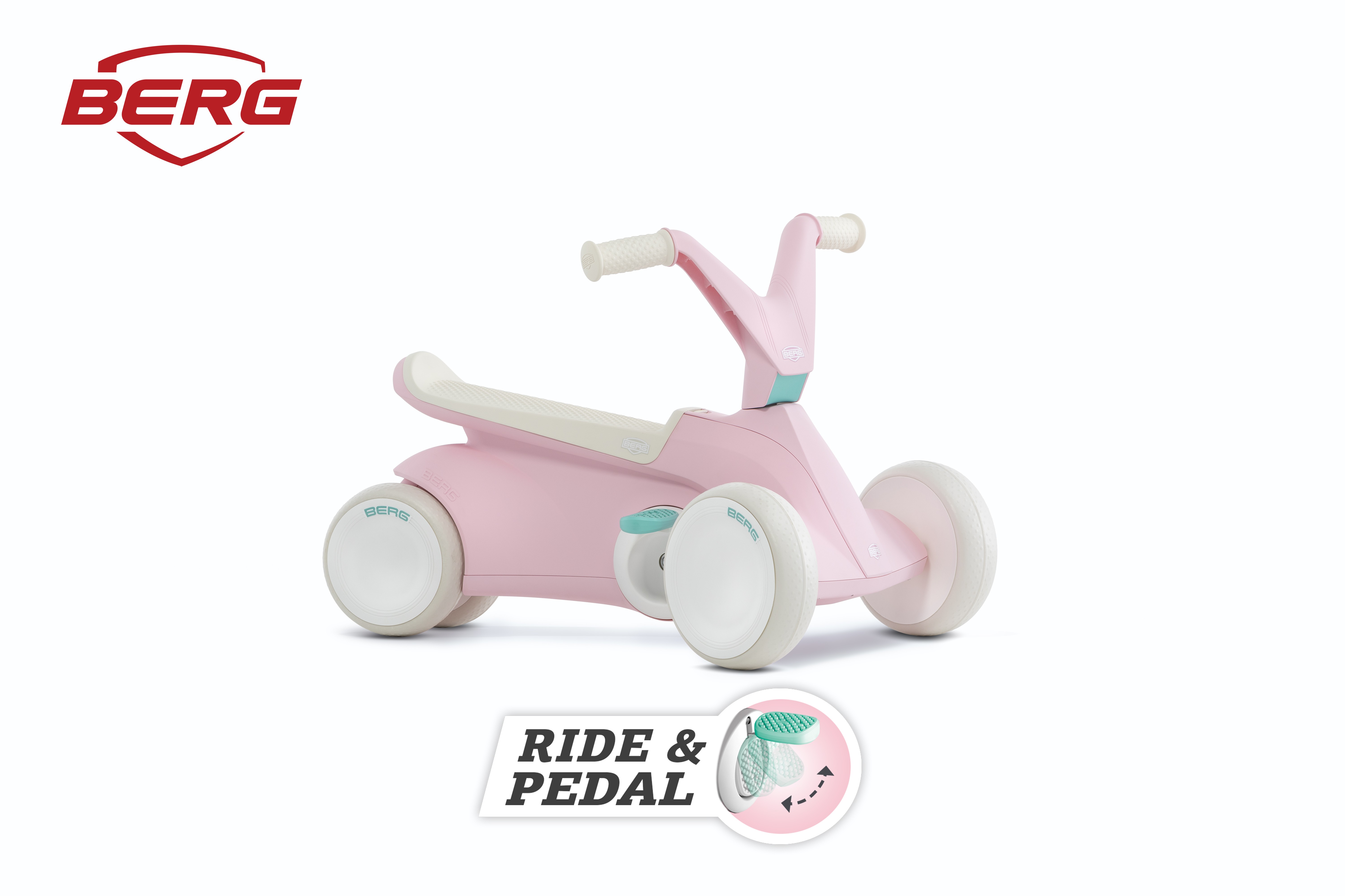 Age Group: 10-30 months old Is your child growing quickly? No problem! Your child sits perfectly on the BERG GO² without having to adjust the saddle or the steering wheel. Learn to ride and pedal with the BERG GO². In short, 2 in 1! The structure of the saddle will prevent your child from slipping off it. Silent whisper tyres to ride around quietly and which never go flat. Your child can set off easily on the BERG GO² due to the direct drive. The ball bearings in the pedal and rear axle make this go-kart supple and light to ride. In addition to riding forwards, your tiny tot can also reverse. Firmly and safely grounded due to the 4 wheels. Your child maintains control because the steering wheel and the pedals can be operated independently. Thanks to the ergonomic design, your tiny tot will not catch his or her little feet on the pedals or rear wheels. Thanks to the sleek, ergonomic design, the BERG GO² is a real eye-catcher in and around the house. The BERG GO² not only makes playing fun, it also helps your child’s physical and cognitive development. Available in 3 cool, timeless colours: Mint, Blue and Pink Maximum user weight: 20kg Product Dimensions: 65x45x44cm Product Weight: 3.85kg Indoor and outdoor useThe development of your child begins on a BERG GO². The BERG GO2 is our sleek and ergonomic go-kart for the youngest children! Children from the age of 10 months learn to scoot first with the pedals folded up. Before you know it, your child will be scooting around the whole room. You can then unfold the pedals very easily so that your child can experience go-karting for the very first time!