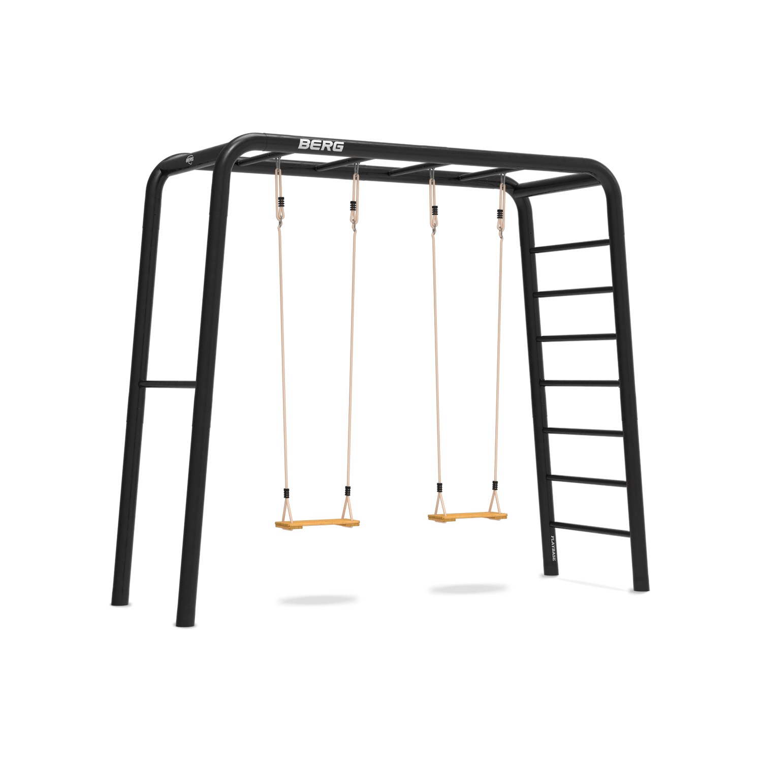 ONLY PRE-ORDERS Two sizes available: Playbase Medium – 285 x 100 x 245c & Playbase Large – 380 x 100 x 245cm. This set is the PlayBase MEDIUM frame with two ladders. Other Playbase Medium are available with one tumble bar and a ladder or you can have two tumble bars. Once the main frame has been chosen you can add play, sport or lounge accessories to complement the set and to fit you or your childrens mood. Strong, robust frame = galvanized + powder-coated in black. Different accessories for play, sport & lounge. Mount or quickly remove accessories with the practical click system. Always remains interesting = grows with your family. Modern look in black. Simply dig into the ground - without concrete or foundation. Choose how you want your BERG PlayBase to be equipped.BERG PlayBase is a playset for the (also smaller) garden, which can also be converted into sports equipment and lounge equipment. You can hang a swing or nest swing in it, but you can also turn it into a climbing apparatus, a home gym, relax in it or grow plants against it, for example. The ideal garden playset that can already be used for toddlers and older children up to adults!