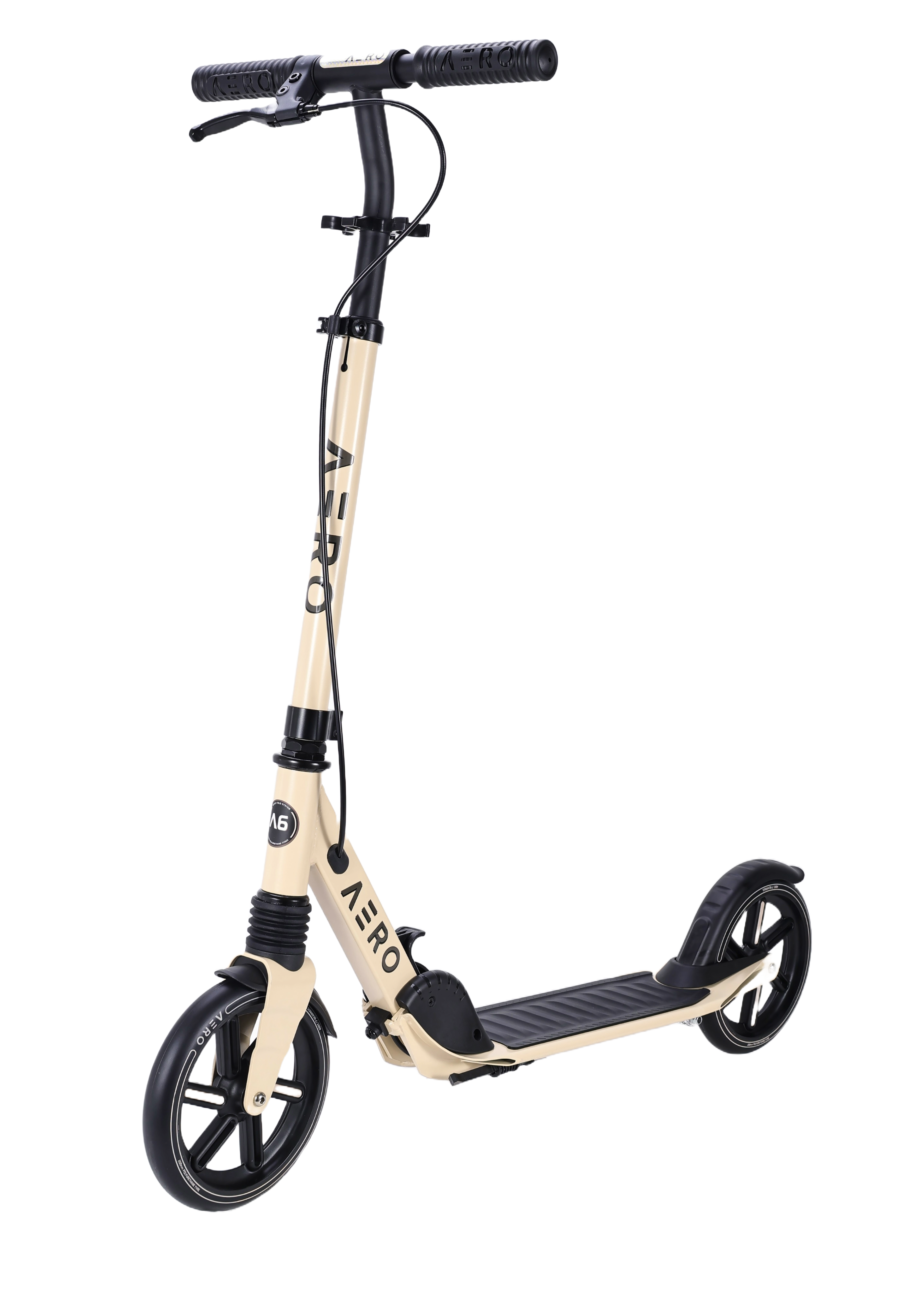 For children 8 years old + and Adults; Max Load: 100kg; Foldable and Height adjustable; Front Suspension; Kickstand included; Product Size: 93*37*99cm; Product Folded Size:87*41*38cm; Frame: Steel; Wheel: PU/200mm /85A; Brake system: hand brake and foot brake; Bearing: ABEC-7; Available colours: Beige or GreyThe AERO A6 kick scooter is specially designed for big kids 8-12, teens, and adults. It is perfect for both recreational sports and short-distance commuting.In additional to the standard foot brake, this adult 2 wheels kick scooter features a hand-operated brake for enhanced control and safety. This scooter for adults is equipped with 8” big PU wheels and built-in shock absorption, ensuring a smooth and comfortable ride on hard and uneven surfaces. This adult kick scooter comes with an extra wide deck with anti-slip rubber mat, which is soft and durable, and so you do not worry that it gets dirty or wet anymore.This adult scooter adopts a reliable folding mechanism. The handlebar height is can be adjusted to ‘evolve’ with your children ensuring a best fit for boys or girls ages from 8 to 12 years old, teens, big kids, youth as well as adults, as it supports up to 100kg.