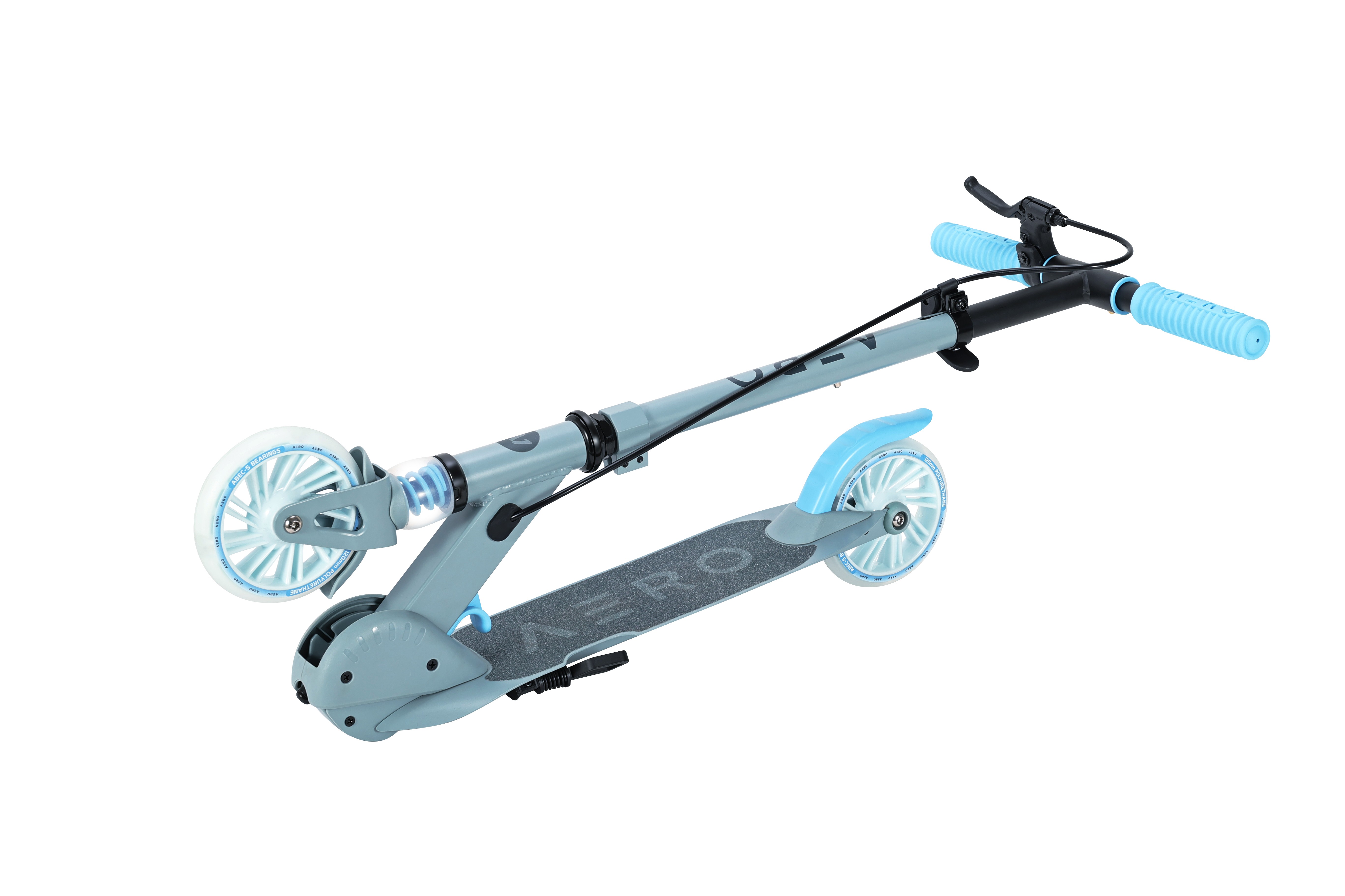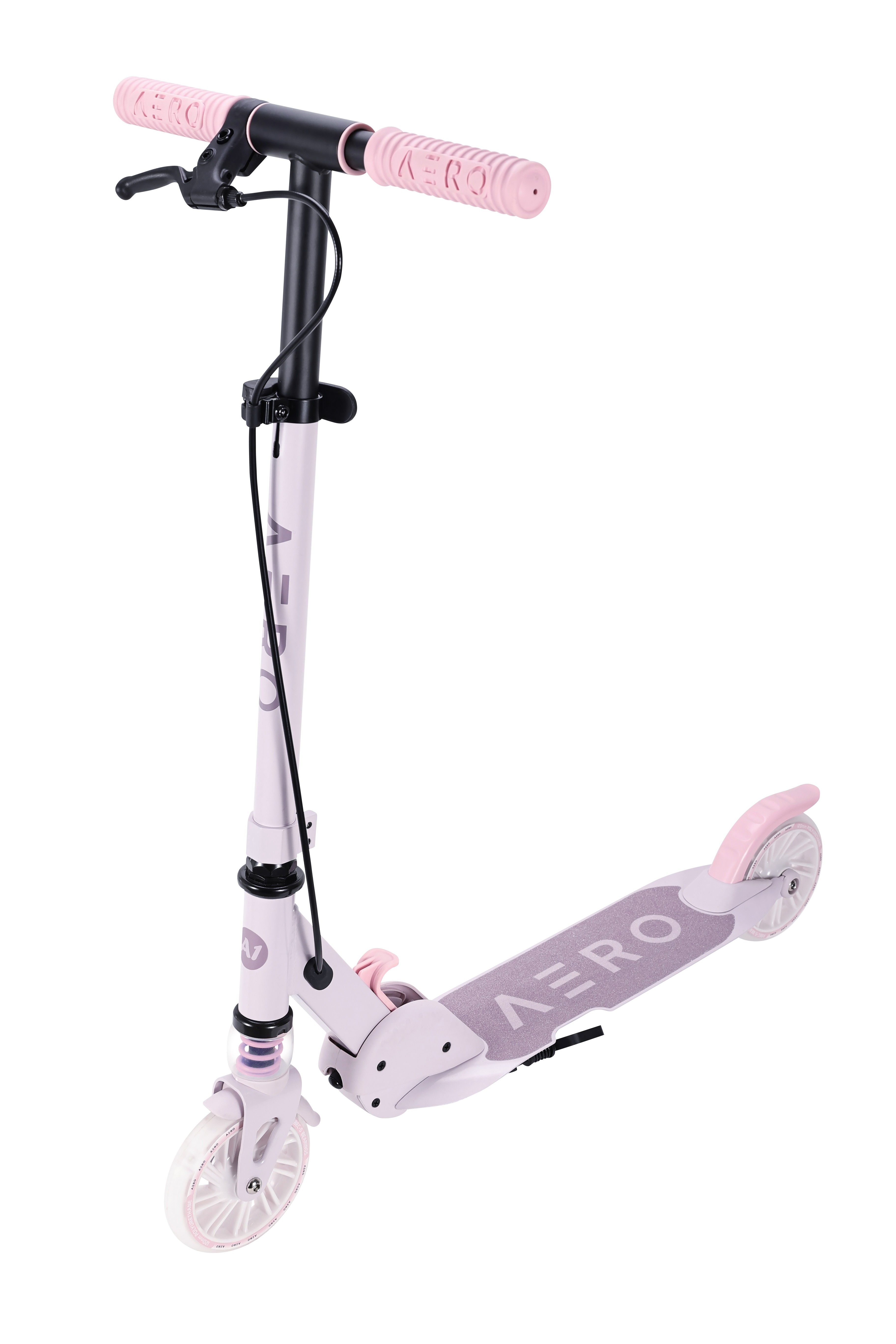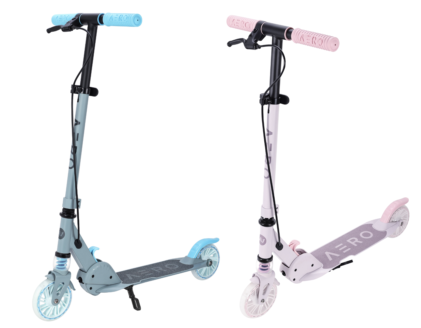 For children 5 years old +; Max Load: 50kg; Foldable and Height adjustable; Front Suspension; Kickstand included; Product Size: 67*33.5*82cm; Frame: Steel; Wheel spec:125 mm polyurethane(PU); LED Wheels; Brake system: hand brake and foot brake; Bearing: ABEC-5; Available colours: Blue or PinkAero A1 two wheels kick scooter is designed for kids ages 5+. It encourages boys or girls to get outside and exercise while having fun. In additional to the standard foot brake, this kids scooter features a hand-operated brake for enhanced control and safety. This scooter for kids is equipped high-rebound PU wheels and built-in shock absorption, ensuring a smooth and comfortable ride on hard and uneven surfaces. This children scooter comes with motion-activated light up wheels, making it one of the coolest rides on the planet. This 2 wheels kid scooter adopts our patented folding mechanism. The handlebar height grows with your child, ensuring a perfect fit for boys or girls ages from 5 year old, or up to 50 kg. Simply unfold your Aero Scooter, adjust the handlebar to your ideal height, and you're ready to go