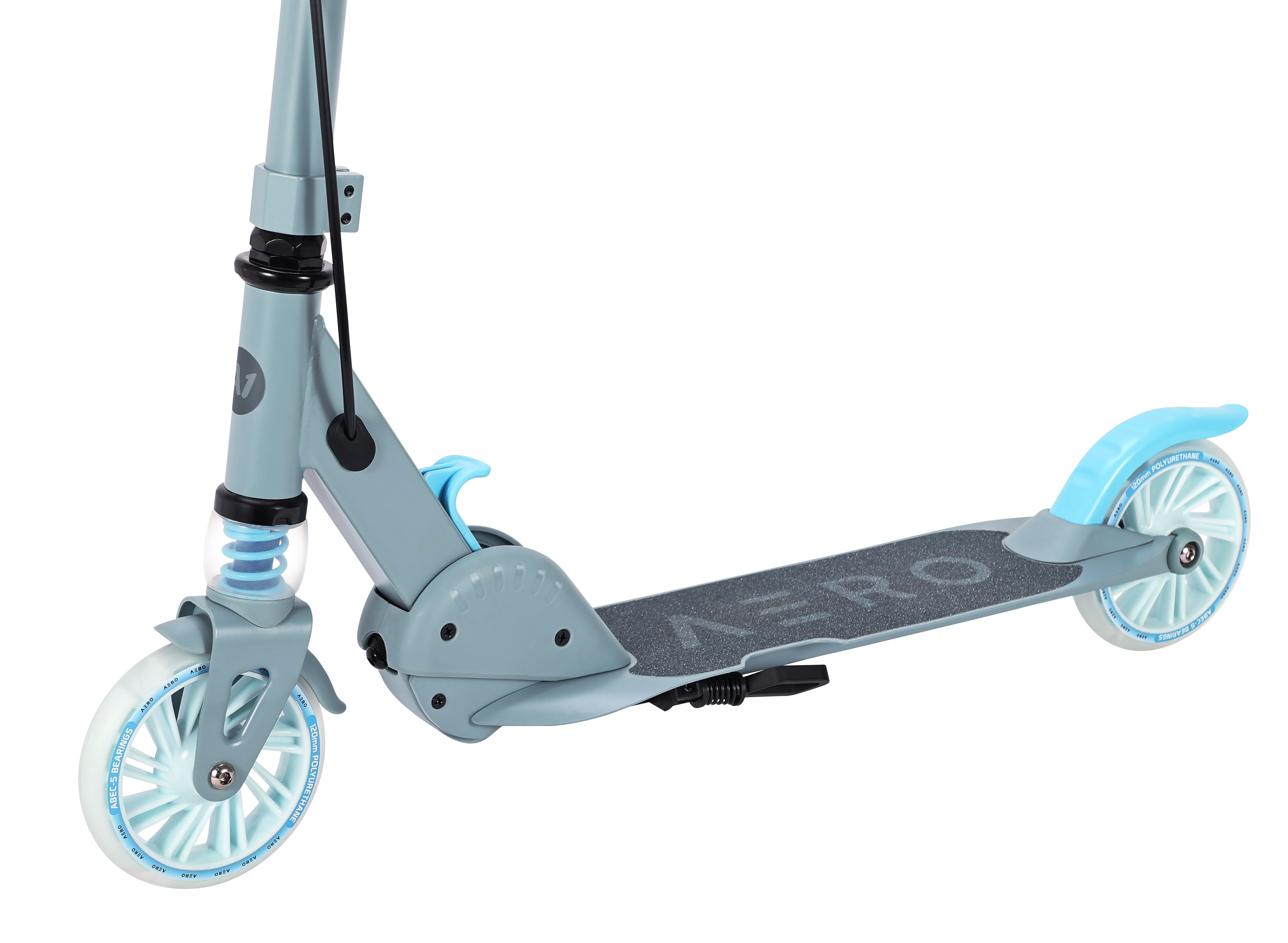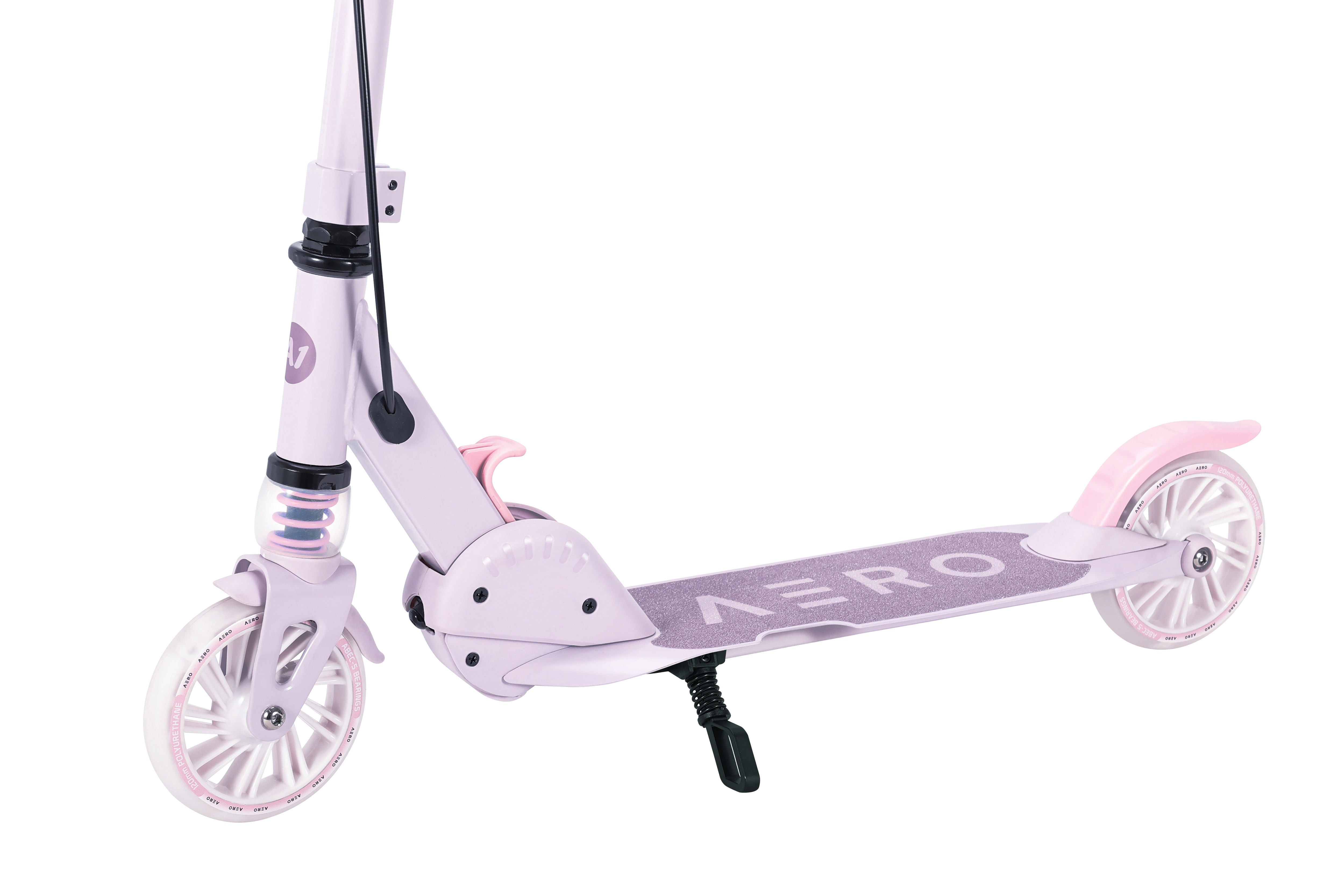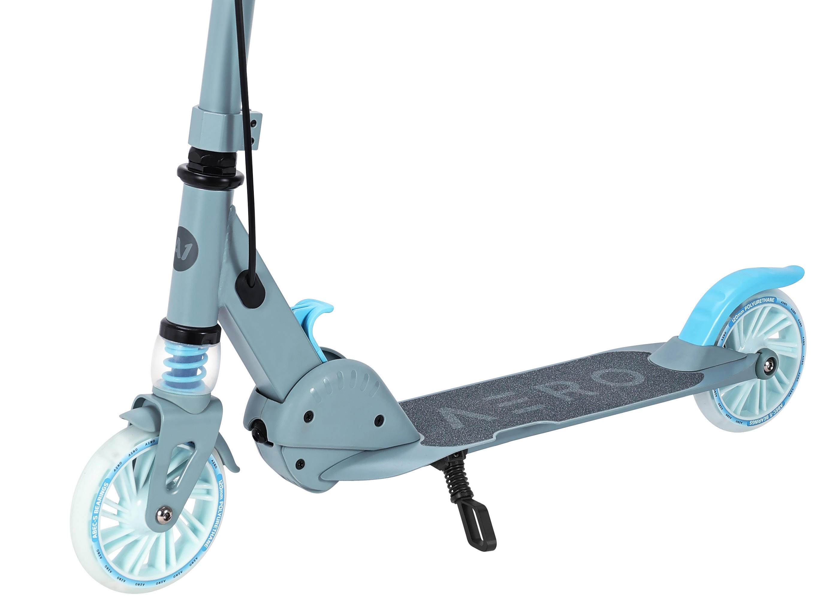 For children 5 years old +; Max Load: 50kg; Foldable and Height adjustable; Front Suspension; Kickstand included; Product Size: 67*33.5*82cm; Frame: Steel; Wheel spec:125 mm polyurethane(PU); LED Wheels; Brake system: hand brake and foot brake; Bearing: ABEC-5; Available colours: Blue or PinkAero A1 two wheels kick scooter is designed for kids ages 5+. It encourages boys or girls to get outside and exercise while having fun. In additional to the standard foot brake, this kids scooter features a hand-operated brake for enhanced control and safety. This scooter for kids is equipped high-rebound PU wheels and built-in shock absorption, ensuring a smooth and comfortable ride on hard and uneven surfaces. This children scooter comes with motion-activated light up wheels, making it one of the coolest rides on the planet. This 2 wheels kid scooter adopts our patented folding mechanism. The handlebar height grows with your child, ensuring a perfect fit for boys or girls ages from 5 year old, or up to 50 kg. Simply unfold your Aero Scooter, adjust the handlebar to your ideal height, and you're ready to go