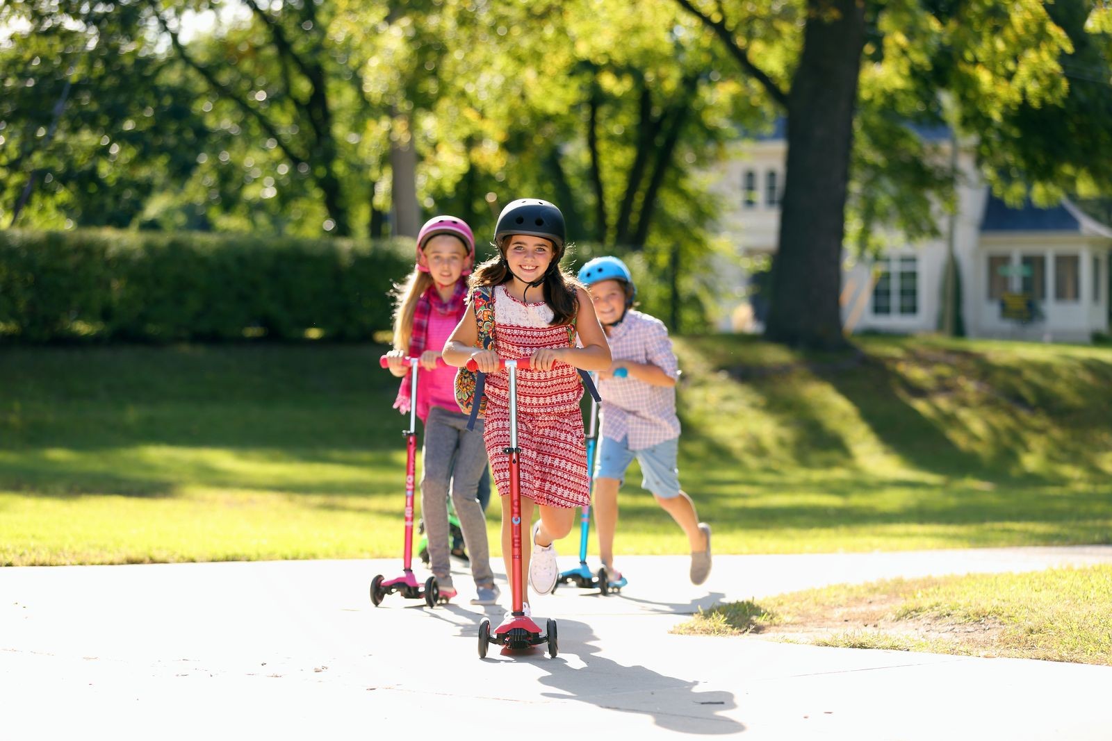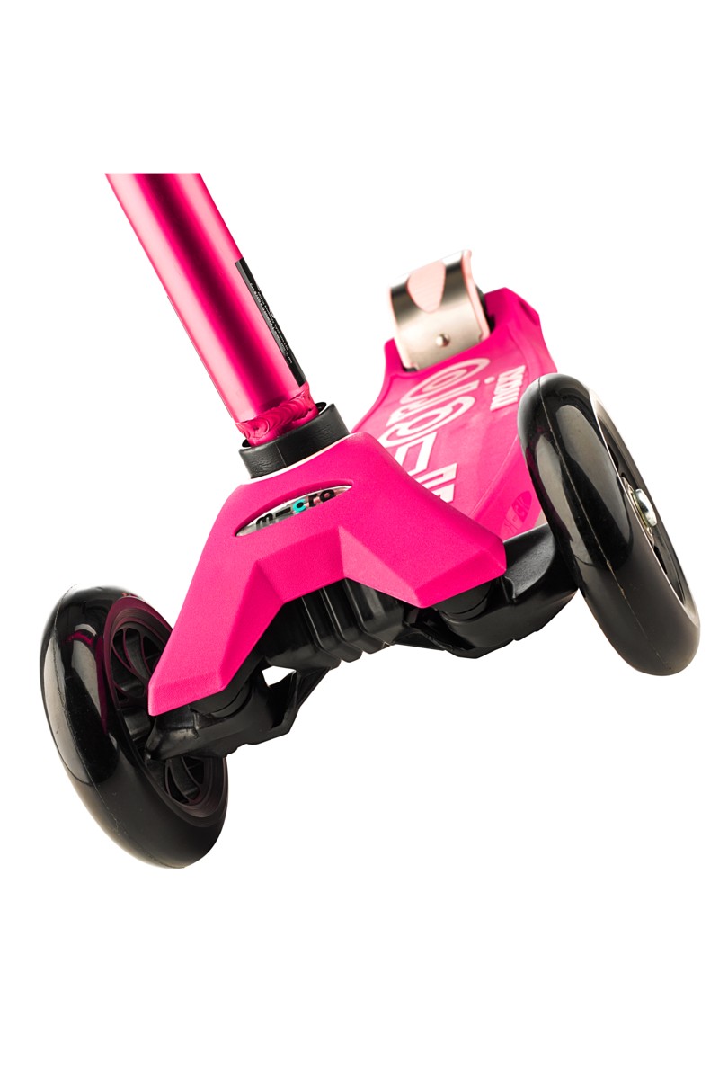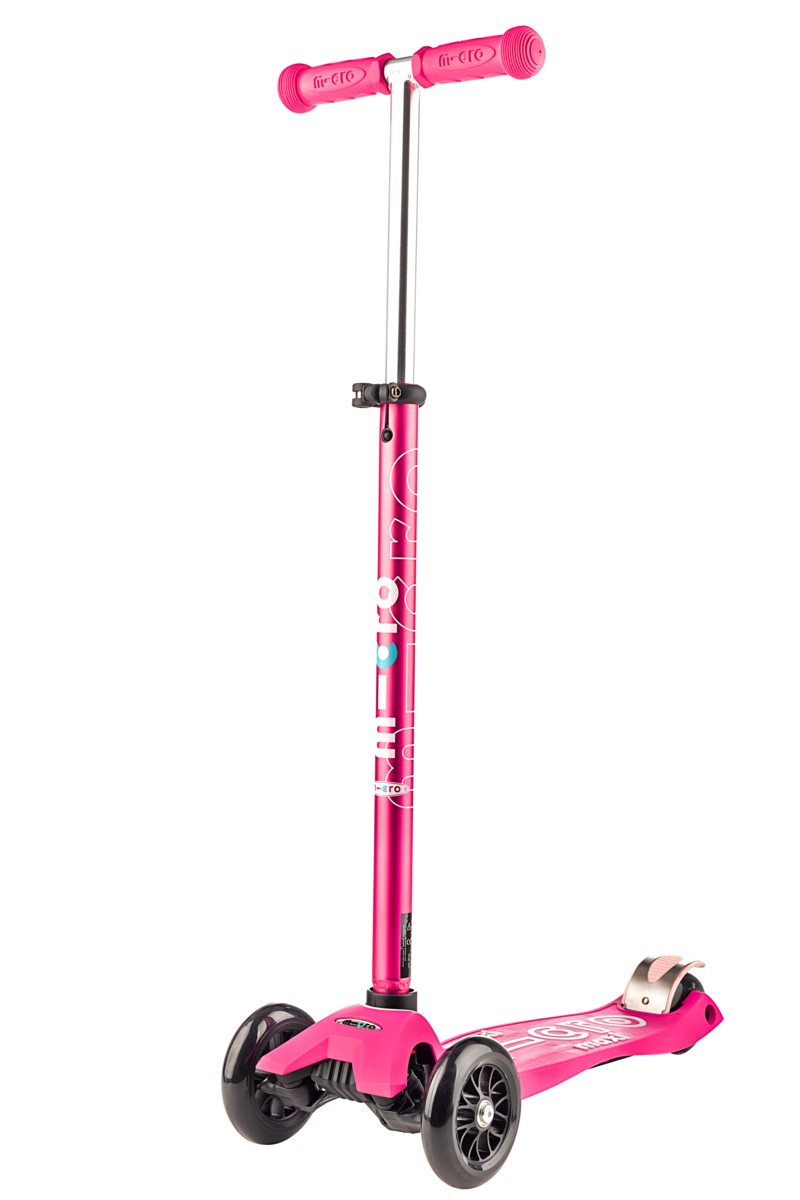 For children 5 to 12 years old Max Load: 50 kg Three wheels for superior stability Wheel size: 120/80mm Wheel Material: PU Tbar Height: 67cm - 91cm Tbar Removable and Adjustable Product Weight: 2,5 kg Available colours: Blue, Pink, Red, Green, and Purple Patented, Swiss designAdditional grip on the deck for a safer ride! The Maxi Micro Deluxe is the follow-up product to the Mini Micro, especially designed for kids who have outgrown the Mini Micro but are still too small and too light for the aluminium kickboards. The deck can carry a body weight of up to 50 kg. It only weighs 2.5 kg, therefore steering is particularly easy and you practically glide over the asphalt. The additional grip on the deck gives the rider a secure hold, and the anodised handlebar adds to the very classy appearance of the Maxi Micro Deluxe.