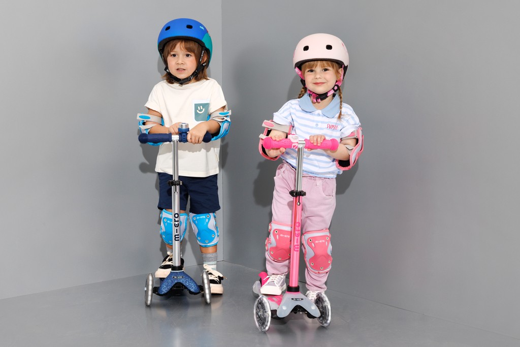 Protecting the knees and elbows when riding a Micro Scooter is extremely important. The Micro Knee and Elbow Pads are available with an easy click-in closure system! Therefore, the length of the straps has to be readjusted only once. Afterwards the protectors can easily be put on and taken off with the click-in closure system. This is particularly handy for kids so that they don’t have to readjust the straps all the time. Furthermore, this way, the Velcro straps don’tt get overused. What a relief for both the children and parents! The unique pads are available in various colours and prints, so there should be a perfect one for every child.