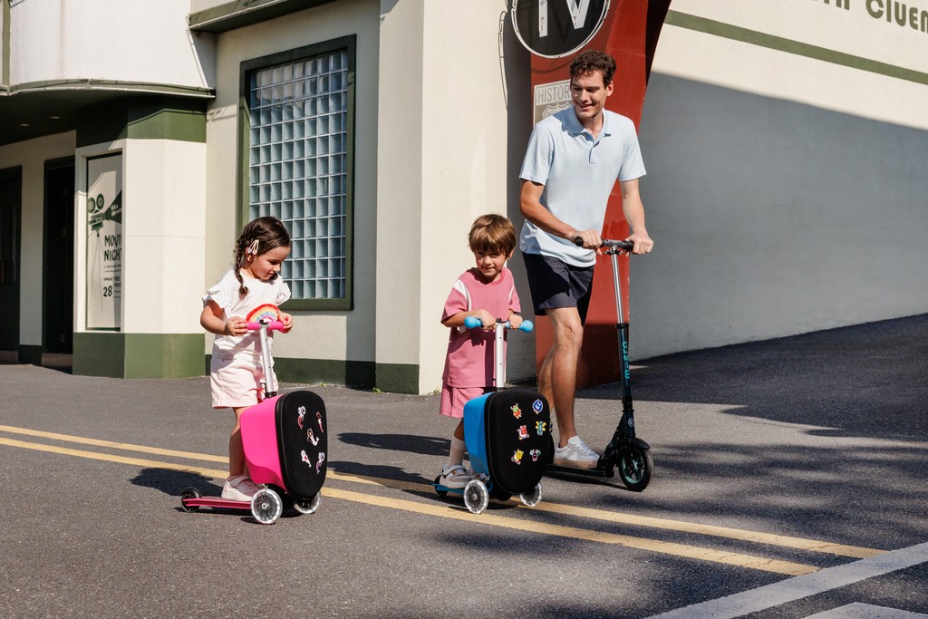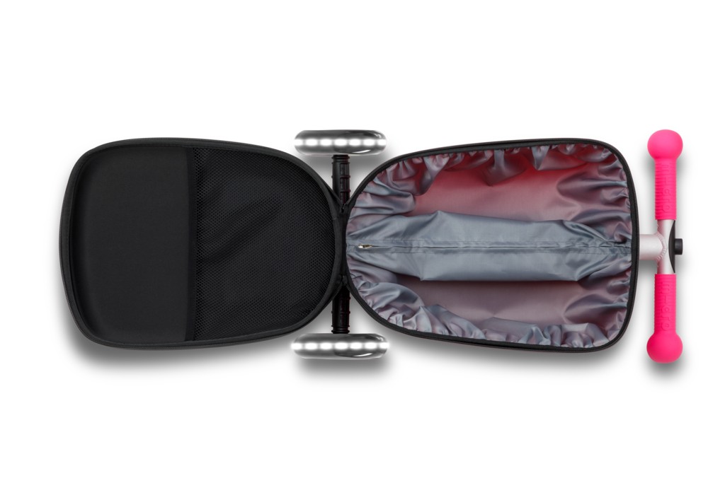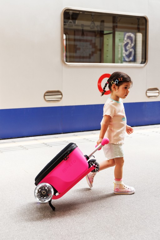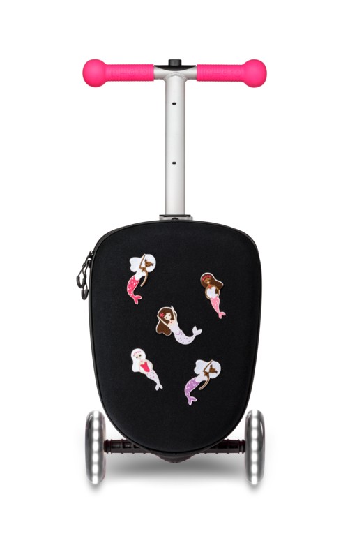 The Micro Scooter Luggage junior Patch & Play combines a children's suitcase and scooter in a unique design. It canbe ridden, pulled, and pushed - whereby pushing offers an ergonomic advantage and is gentle on the muscles and wrists. With the height-adjustable handlebar, the scooter grows with the child and accompanies them up to primary school age.