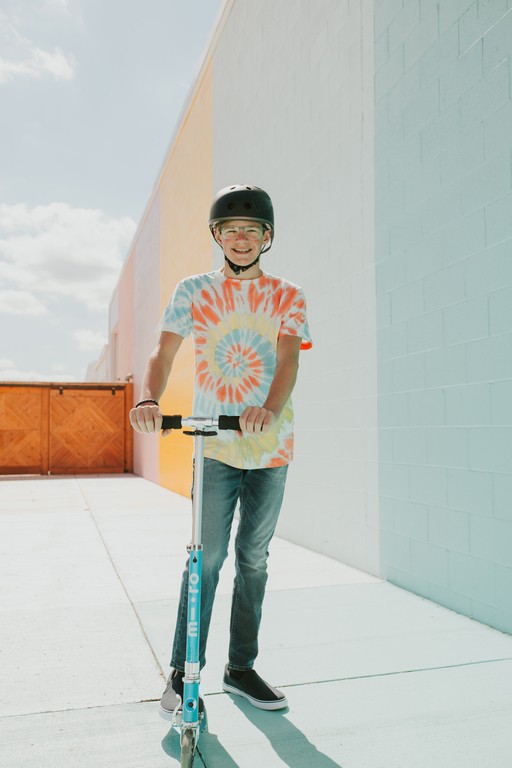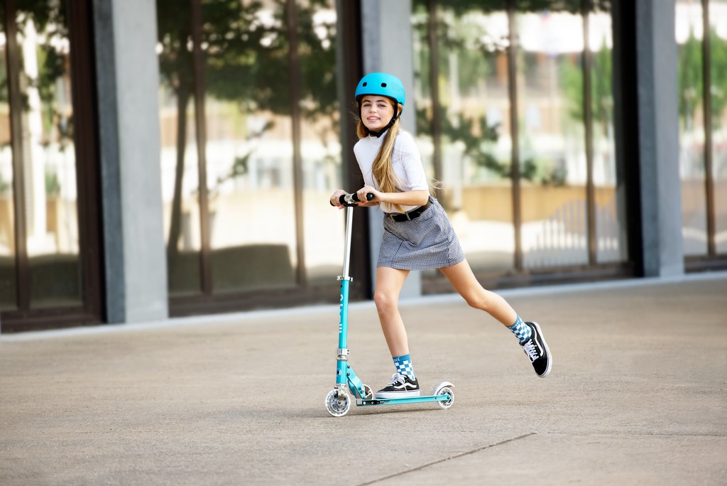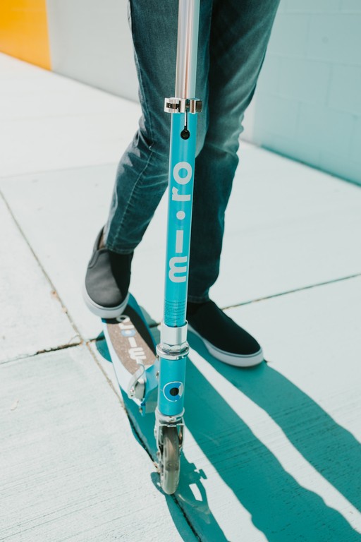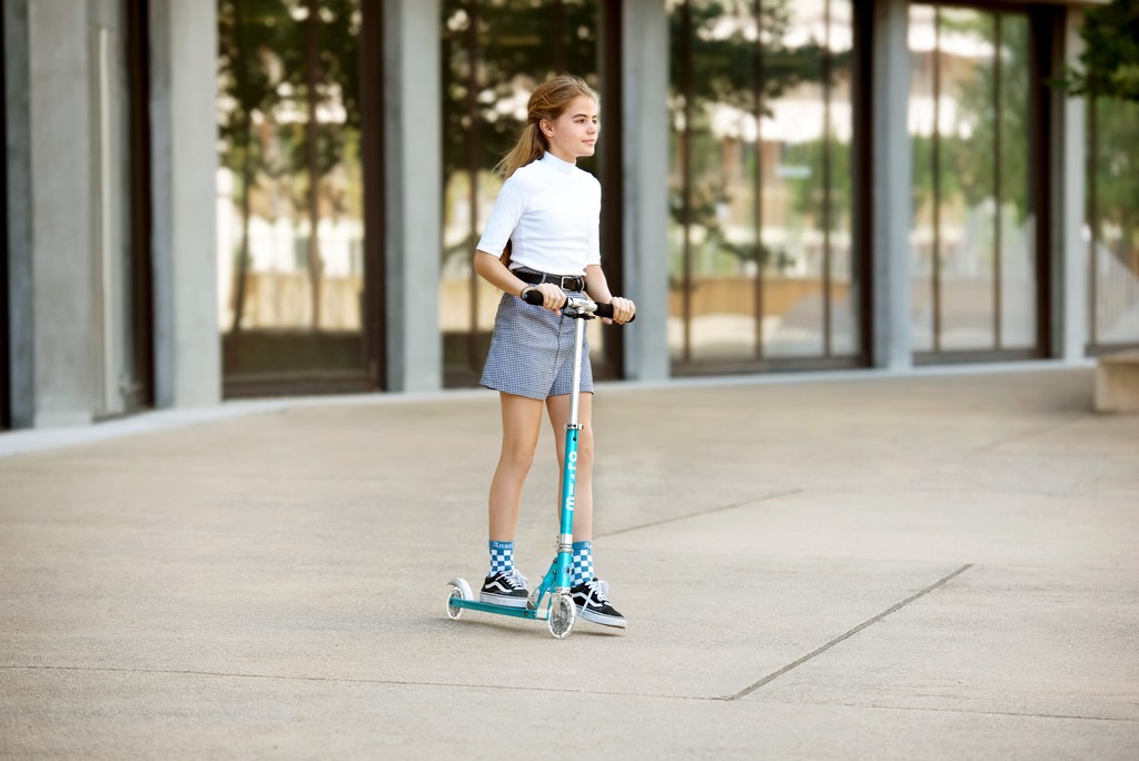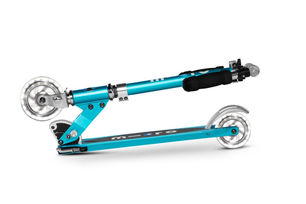 For children from 5 years old to adults Max Load: 100 kg Two wheels Wheel size: 120/100mm Wheel Material: PU Tbar Height: 63cm - 95cm Tbar Foldable & Adjustable Product Weight: 2,85 kg Available colours: Aluminium Silver LED, Ocean blue LED, Purple Stripe LED, and Petrol Stripe LED Patented, Swiss designThe Sprite Classic scooter with extra sparkle! LED wheels at the front and rear give this classic Sprite that extra something. The compact size and light weight guarantee easy handling and effortless carrying. The most lightweight two-wheel scooter ‚ideal for kids, teens and adults up to 100kg!