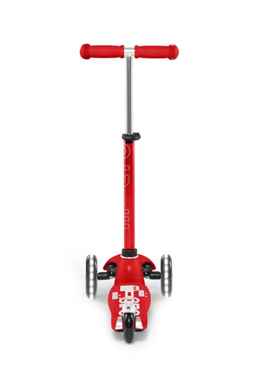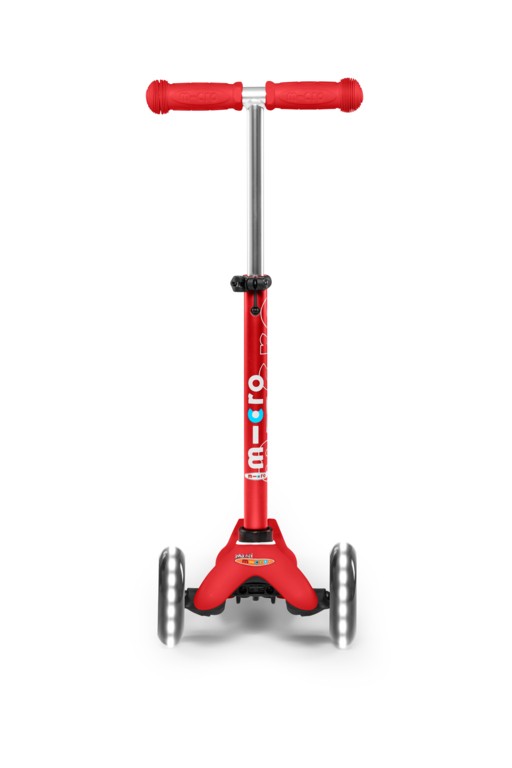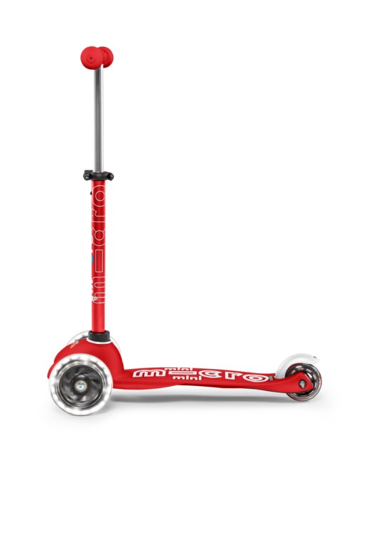 For children 2 to 5 years old Max Load: 50kg Three wheels for superior stability Wheel size: 120/80mm Wheel Material: PU Tbar Height: 49-67cm Tbar Removable and adjustable Lowered board with strengthening flexiglass Deck: Reinforced fibreglass PA, Extra grippy silicone mouldings Product Weight: 1,95 kg Available colours: Blue, Purple, and Red Patented, Swiss designThis Micro Scooter glows with motion-powered LED wheels generated through dynamo mechanics. The wheels’ dazzling illumination not only makes riding your scooter more fun, it also enhances your visibility in the dark. In contrast to the classic Mini Micro, the Deluxe version has a height-adjustable handlebar, which is equipped with a safety system for children. However, parents can still easily remove the handlebar to stow the scooter under the stroller or in the trunk. The non-slip silicone footboard provides additional support and a safe ride. Thanks to the patented steering mechanism, this unique toy promotes not only movement but also balance and motor skills of the little ones. It was developed in cooperation with medical specialists especially for pre-school children. With the large selection of colours, every child will find their new favourite scooter!