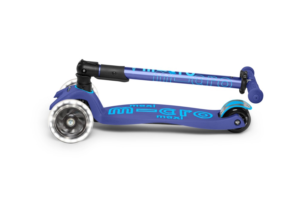 For children 5 years old + Max Load: 50 kg Three wheels for superior stability Wheel size: 120/80mm with LED Wheel Material: PU Tbar Height: 67cm - 91cm Tbar Foldable & Adjustable Product Weight: 2,8 kg Available colours: Bright Blue, Coral Pink, Volcano Grey, Berry Red, Petrol Green, Shocking Pink, Navy Blue and Red Patented, Swiss designThis Maxi Micro from the Deluxe family scores points with two extra features: Firstly, the intuitive folding mechanism ensures that the kickboard can be folded with a simple movement of the hand and stored anywhere. Whether in the boot, under the chair at school or in the locker - there is always room for the Maxi Micro Deluxe Foldable LED. Secondly, the sparkling LED wheels make sure that you can see the kids from a distance, even in the dark. The light is generated by a dynamo mechanism. Thanks to the inductive charging process, no batteries are needed. Furthermore, ABEC 9 ball bearings guarantee highest precision and durability. The illuminated wheels not only look cool but also provide more safety.